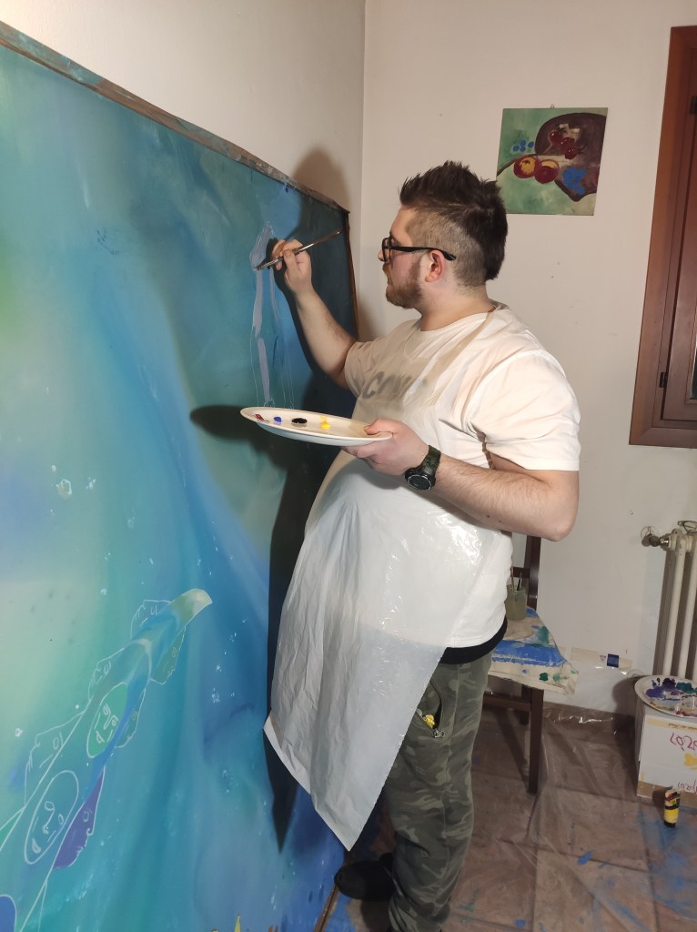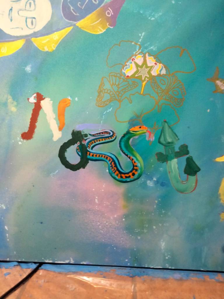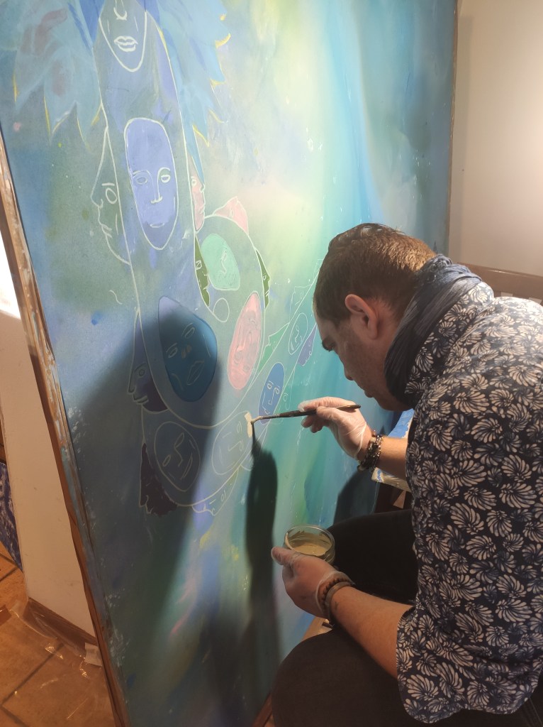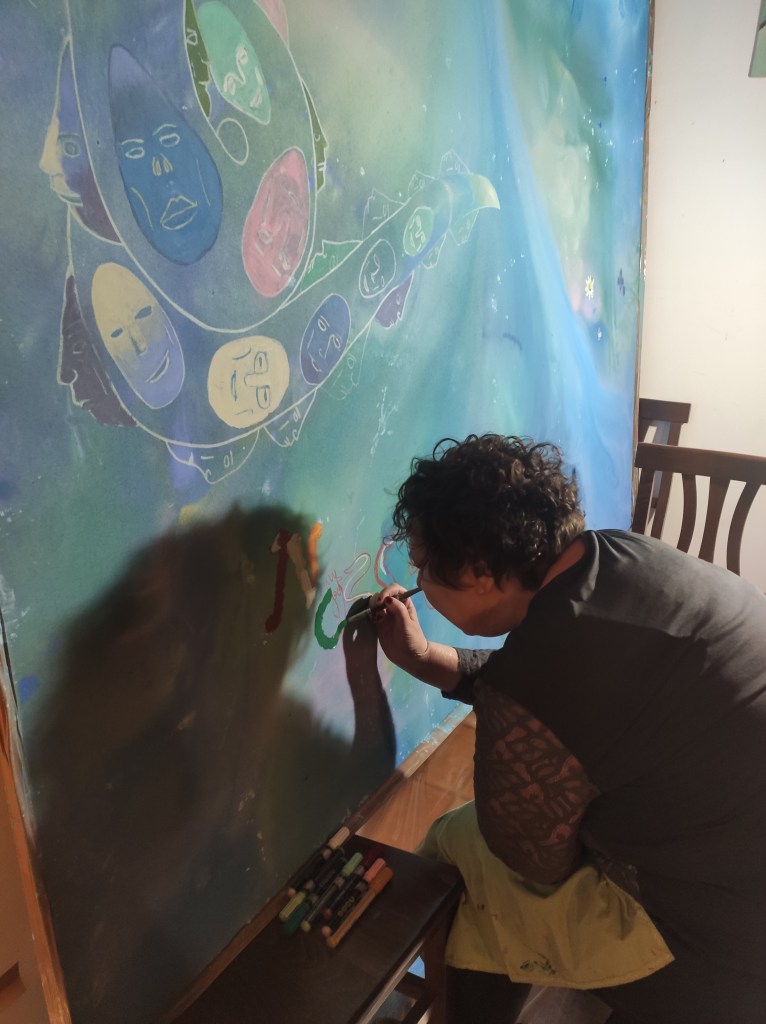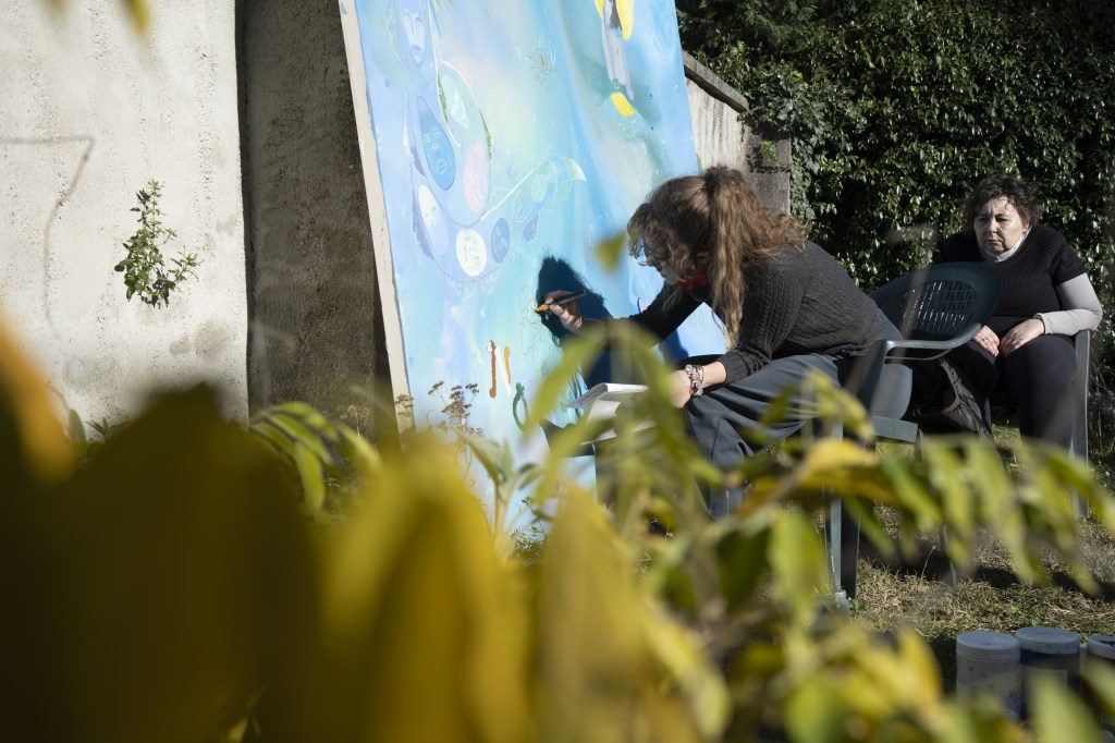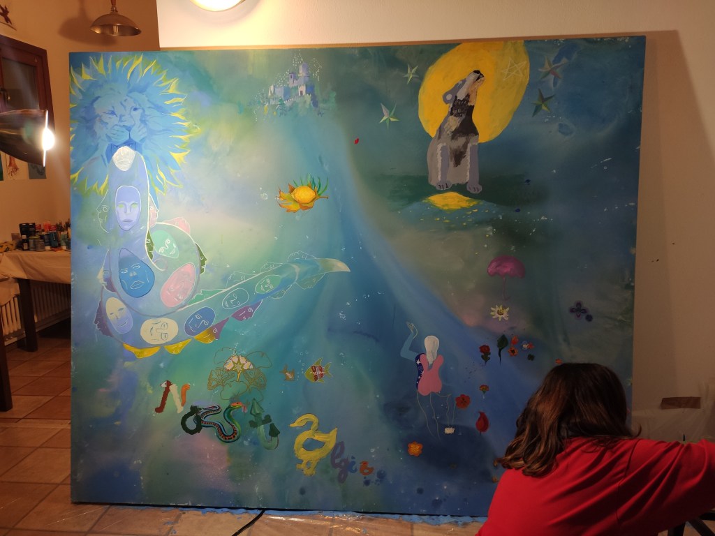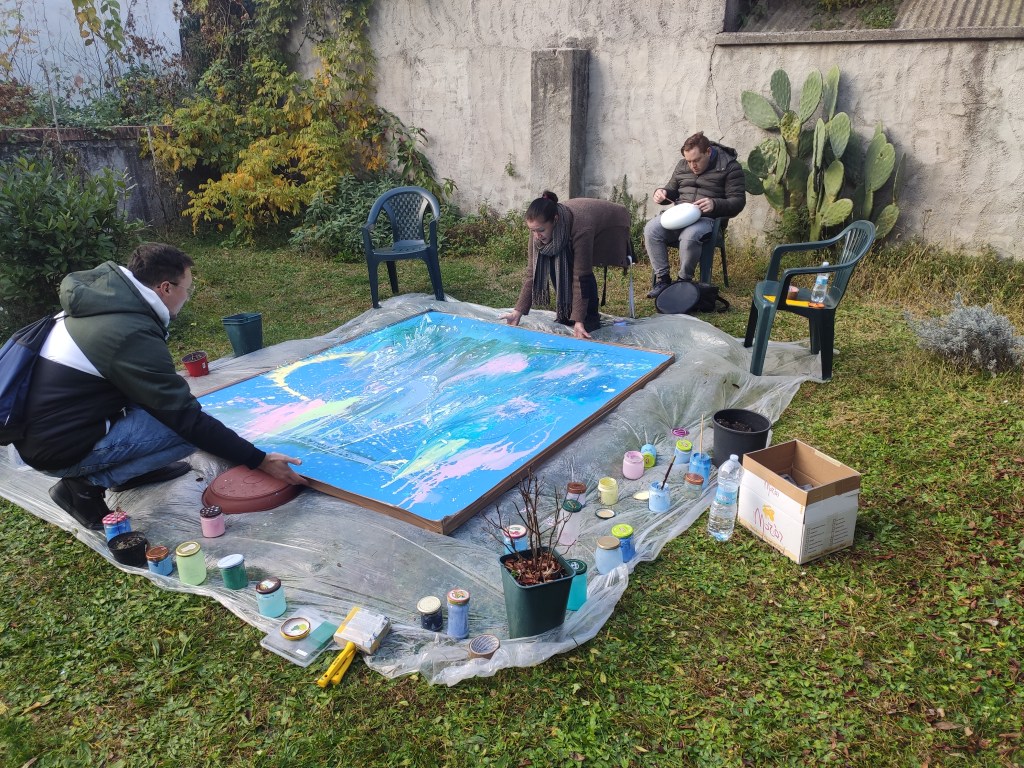 Per stimolare la curiosità dei partecipanti, residenti e operatori, e sfidarli rispetto alle loro competenze, ho introdotto una novità rispetto ai laboratori precedentemente realizzati, avviando il gruppo alle diverse tecniche pittoriche. Le potenzialità fascinanti del colore possono sembrare semplici da manovrare, ma a livello esecutivo queste tecniche richiedono molta concentrazione, la pazienza di mischiare e ottenere i colori voluti e di procedere gradualmente senza arrendersi facilmente. Abbiamo trascorso i primi giorni disegnando e individuando i soggetti che ciascuno di noi avrebbe trasposto su un grande quadro, a partire da prove dirette su carta o da conversazioni da cui estrarre parole cariche di significato o evocative di immagini forti. Parallelamente, abbiamo preparato, mischiato, diluito in barattoli diversi colori tenui per poi usarli come sfondo. In una giornata di sole abbiamo preparato una grande tela (180 x 220 cm), l’abbiamo portata in giardino e adagiata sull’erba. Dopo aver preparato un set di lavoro, ognuno di noi ha versato in modo libero il colore diluito sulla tela; i colori si sono composti in maniera casuale e fluida, creando un effetto simile alle fotografie astronomiche. Una volta concluso il nostro sfondo, abbiamo lavorato su come connettere i diversi disegni dei partecipanti, come in una “danza”, inserendo e dipingendo pian piano tutte le immagini e dando vita alla composizione finale.