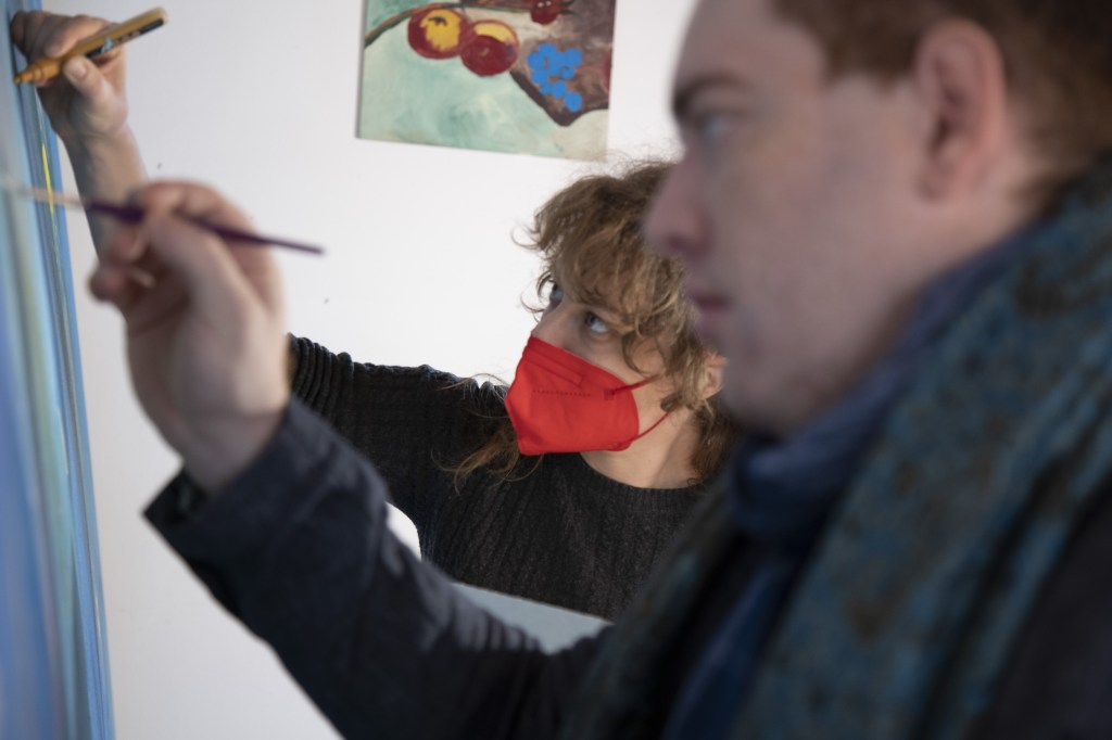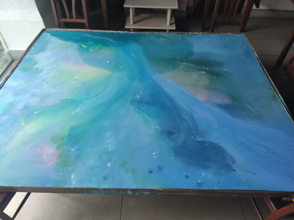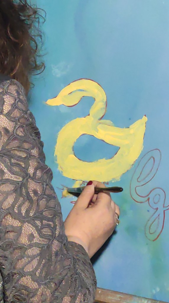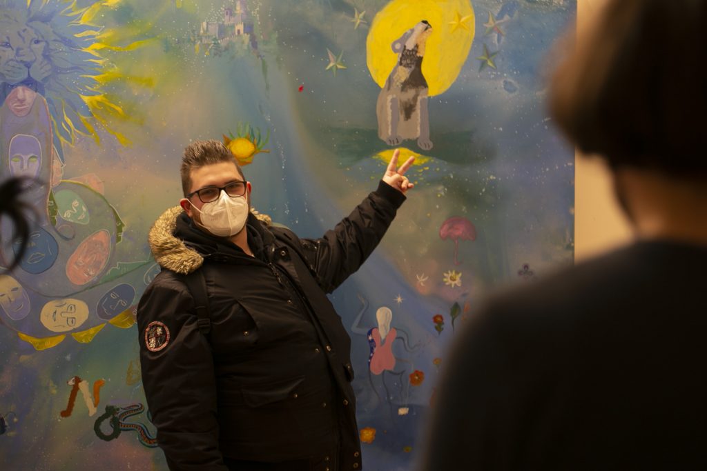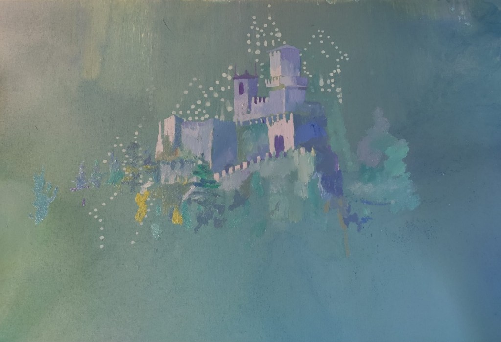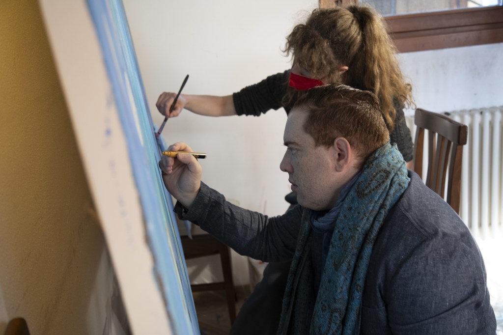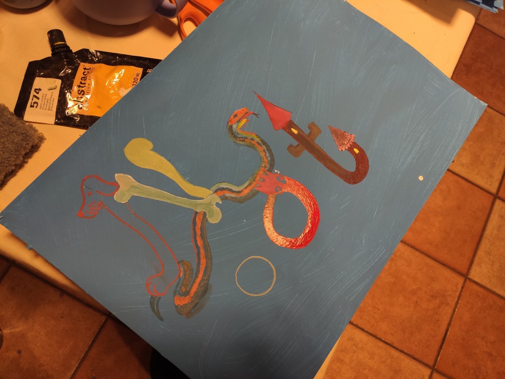 Per stimolare la curiosità dei partecipanti, residenti e operatori, e sfidarli rispetto alle loro competenze, ho introdotto una novità rispetto ai laboratori precedentemente realizzati, avviando il gruppo alle diverse tecniche pittoriche. Le potenzialità fascinanti del colore possono sembrare semplici da manovrare, ma a livello esecutivo queste tecniche richiedono molta concentrazione, la pazienza di mischiare e ottenere i colori voluti e di procedere gradualmente senza arrendersi facilmente. Abbiamo trascorso i primi giorni disegnando e individuando i soggetti che ciascuno di noi avrebbe trasposto su un grande quadro, a partire da prove dirette su carta o da conversazioni da cui estrarre parole cariche di significato o evocative di immagini forti. Parallelamente, abbiamo preparato, mischiato, diluito in barattoli diversi colori tenui per poi usarli come sfondo. In una giornata di sole abbiamo preparato una grande tela (180 x 220 cm), l’abbiamo portata in giardino e adagiata sull’erba. Dopo aver preparato un set di lavoro, ognuno di noi ha versato in modo libero il colore diluito sulla tela; i colori si sono composti in maniera casuale e fluida, creando un effetto simile alle fotografie astronomiche. Una volta concluso il nostro sfondo, abbiamo lavorato su come connettere i diversi disegni dei partecipanti, come in una “danza”, inserendo e dipingendo pian piano tutte le immagini e dando vita alla composizione finale.