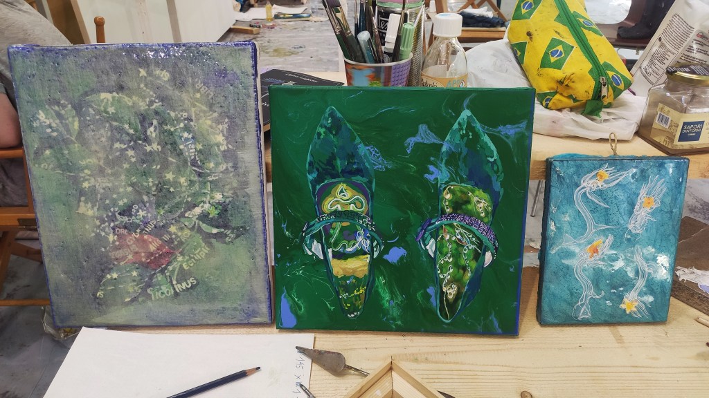 Стоя тук, в този момент, оборудвана с какво ли не. С дата, телефон – портал към безкрайни подразделения. Слушалки, слушам музика. В Антарес съм, късмет, заслужавам го, искам го, уважавам го. Имам много цветове, бои, материали и пред мен синьото ми quadro/платно. Две приятни чудовища. Мозъкът ми е бавен и мързелив. Цветовете ме хипнотизират. Имам силно желание di approfondire insieme al mio quadro. Così addentrando duro un pochino e mi distraggo. Come quando tieni il respiro sotto l’acqua ed ad una certa ti espulsi da solo sopra l’acqua perché non avevi più aria nei polmoni. Non riesco a trattenermi con la coda del octopus. È molto difficile. Mi ipnotizza anche la sabbia del deserto. È un quadro che abbraccia con il suo generoso e delicato ultramarine. Il rosso del octopus ti presenta davanti ad un ostacolo seducente. Un ostacolo che vuole portarti verso la profonda intelligenza.